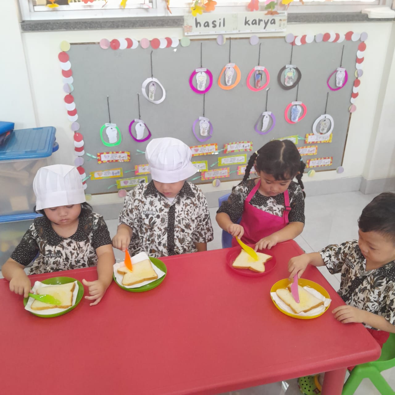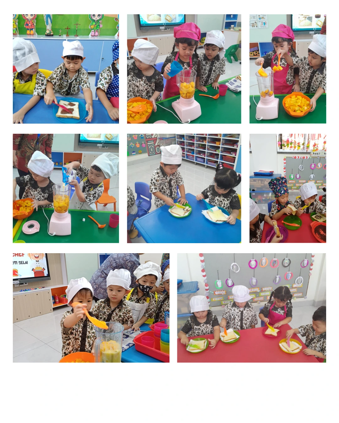 Anak-anak KB mengikuti kegiatan Little Chef pada tanggal 10 dan 11 November 2025 yang lalu dengan seru. menu makanan yaitu membuat camilan sederhana. Mereka belajar mengoles roti menggunakan selai dengan alat makan kecil serta menyiapkan jus mangga segar bersama guru. Anak-anak tampak antusias mencoba sendiri, melatih motorik halus, kemandirian, dan keberanian bereksplorasi di dapur. Kegiatan ini juga mengajarkan mereka pentingnya makan sehat dan mengenal bahan makanan secara menyenangkan.