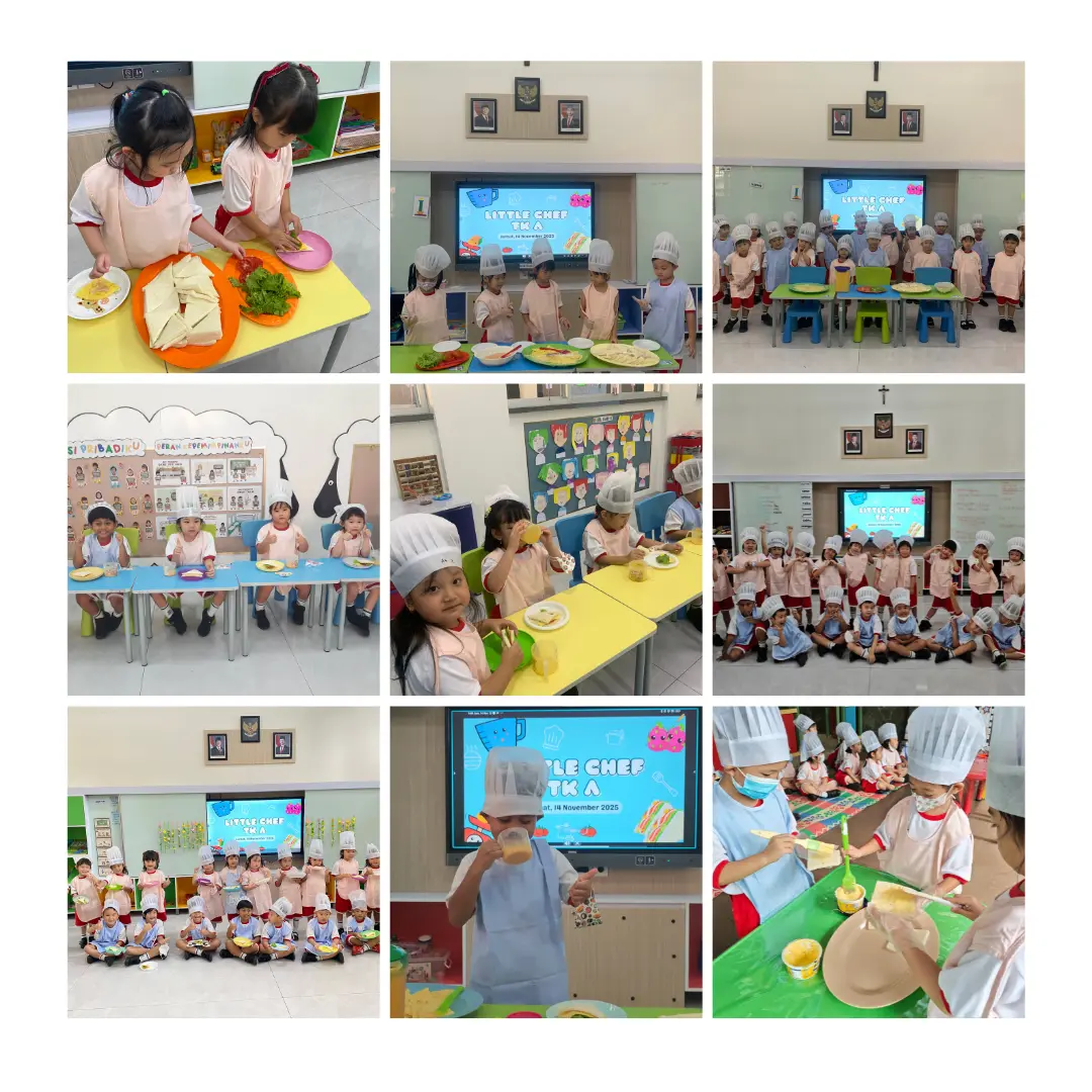 Anak-anak TK A mengikuti kegiatan Little Chef pada tanggal 14 November 2025 yang lalu dengan seru. Menu makanan yaitu membuat camilan sederhana. Anak-anak tampak antusias mencoba sendiri, melatih motorik halus, kemandirian, dan keberanian bereksplorasi di dapur. Kegiatan ini juga mengajarkan mereka pentingnya makan sehat dan mengenal bahan makanan secara menyenangkan.