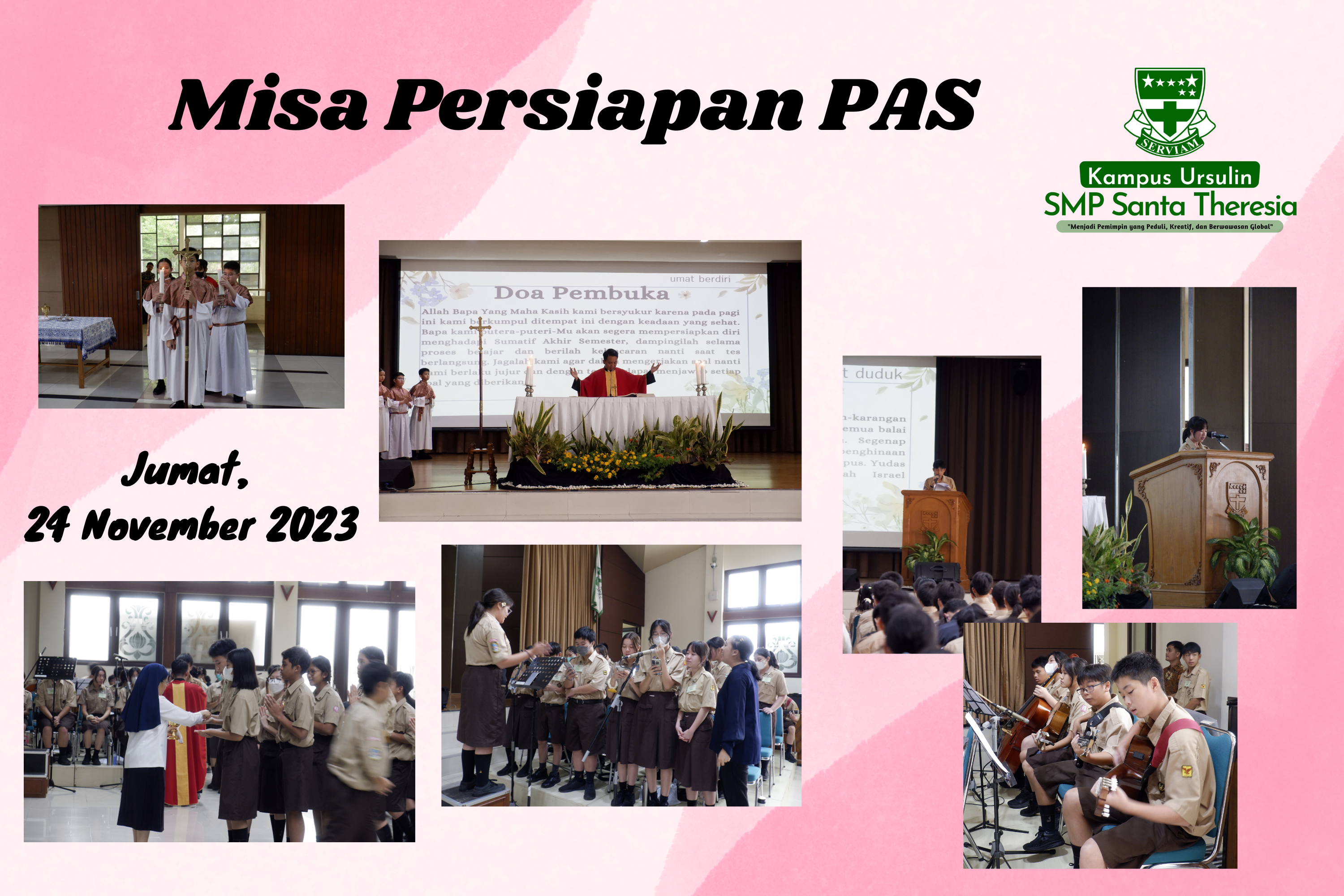 Misa Persiapan PAS dilaksanakan pada Jumat, 24 November 2023. Misa ini diperuntukkan bagi para peserta didik yang akan menghadapi Sumatif Akhir Semester dan Penilaian Tengah Semester agar mereka sungguh siap secara rohani sehingga mereka dapat mengerjakan soal-soal dengan baik. Misa ini dipimpin oleh Romo Andreas Sulardi, Pr.