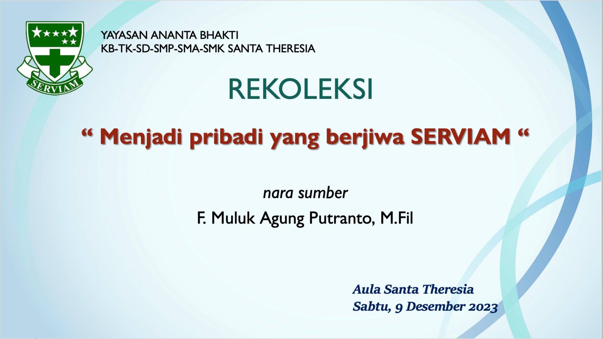 Rekoleksi dengan tema “Menjadi pribadi yang berjiwa SERVIAM” dilaksanakan di aula sekolah pada Sabtu, 9 Desember 2023.