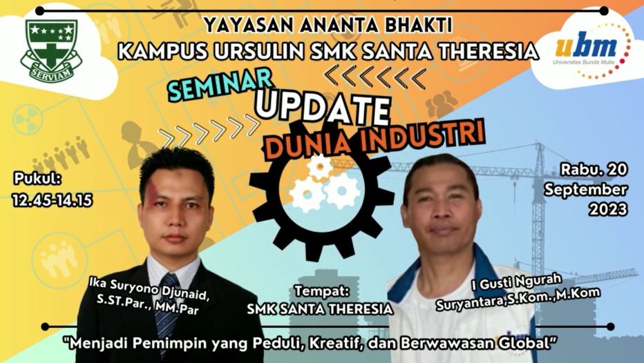 Pada Rabu 20 September 2023, para peserta didik SMK St. Theresia mengikuti kelas UBM. Kegiatan ini bertujuan untuk mengupdate pengetahuan bagi para peserta didik SMK St. Theresia jurusan ULP dan PPLG. Para Dosen UBM hadir sebagai pemateri dalam kelas ini. Kali ini jurusan PPLG mengangkat tema Junior Front End Engineer Berada Dalam Dunia Industri, sedangkan ULP mengangkat tema tentang: Proses Pembuatan Hingga Pemasaran Paket Wisata Di Dunia Industri. Bapak Ika Suryono Djunaid, S. ST. Par,. M. M. PAR membawakan materi untuk kelas X dan XI ULP, sedangkan Bapak I Gusti Ngurah Suryantara, S. Kom, M. Kom membawakan materi untuk kelas PPLG. Berikut adalah beberapa dokumentasi kegiatan tersebut.