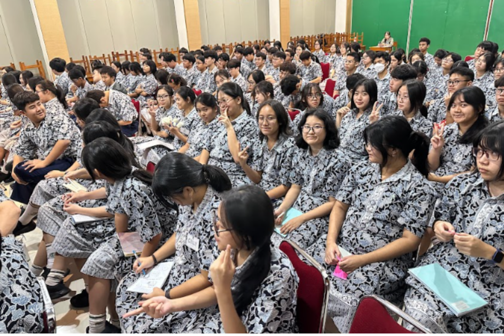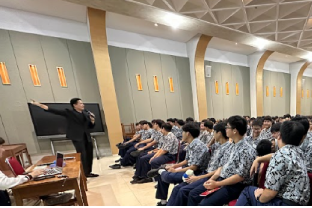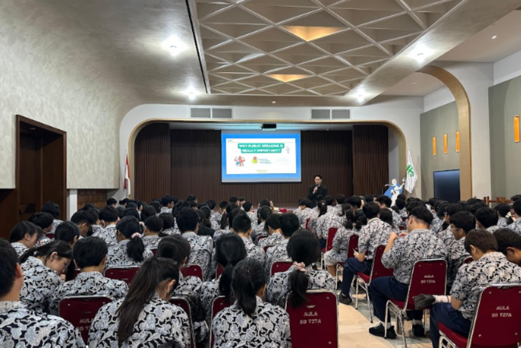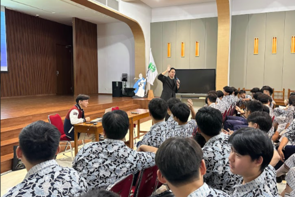 Melvin Bonardo Simanjuntak, dosen dari LSPR, memberikan workshop komunikasi kepada peserta didik kelas X. Kegiatan ini dilaksanakan pada 9 Desember 2025 di Aula SD Santa Theresia.