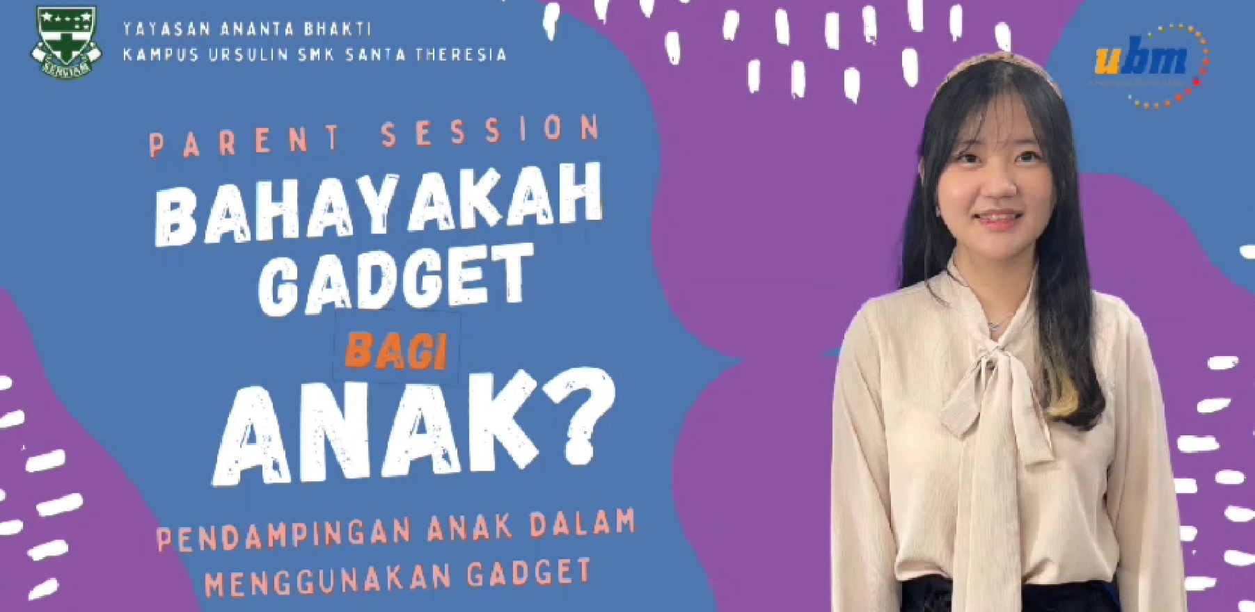 Pada 14 Oktober 2023 seluruh peserta didik SMK St. Theresia kelas X dan XI beserta orang tua mengikuti seminar dengan tema “Bahayakah Gadget bagi Anak?”. Kegiatan seminar ini adalah satu wujud pengembangan aspek formasi dalam tradisi Pendidikan Ursulin yaitu aspek keluarga. Hadir sebagai pembicara dosen Psikologi dari UBM Ibu Abigail Theodora Tanzil S. PSI., M. Psi. Melalui seminar ini pembicara menyampaikan informasi tentang bahaya kecanduan gadget juga tips untuk mengatasi kecanduan terhadap gadget. Para orang tua dan peserta didik antusias mengikuti kegiatan ini. Seminar ini dilaksanakan pada pukul 07.30-09.00 di aula SD.