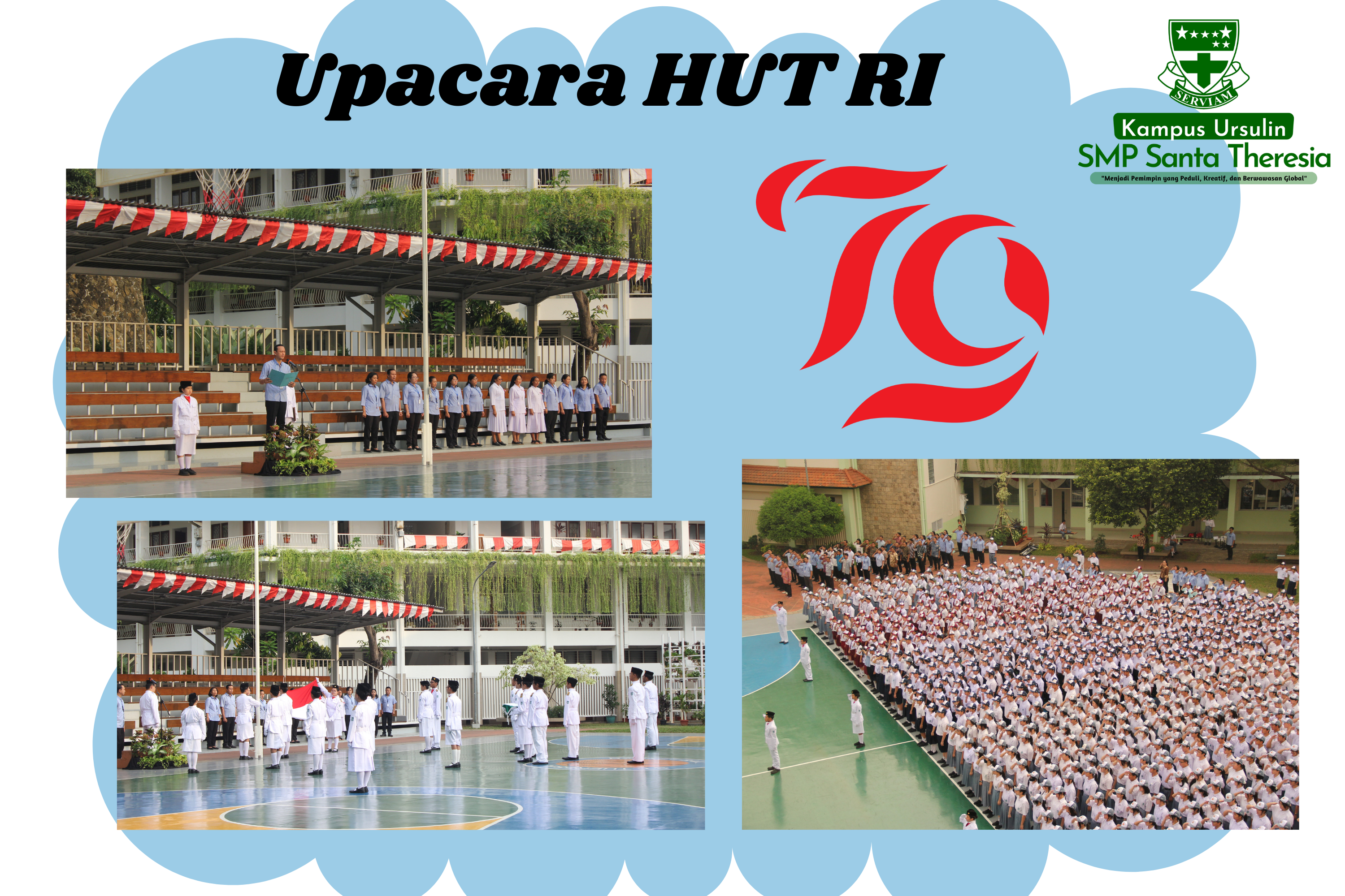 Upacara HUT RI yang dilaksanakan pada 17 Agustus 2024. Seluruh peserta didik dari satuan pendidik SD kelas 5 dan 6, SMP, SMA serta SMK Santa Theresia beserta Bapak Ibu guru , tata usaha dan karyawan mengikuti upacara di lapangan tengah Kampus Ursulin Santa Theresia Jakarta.