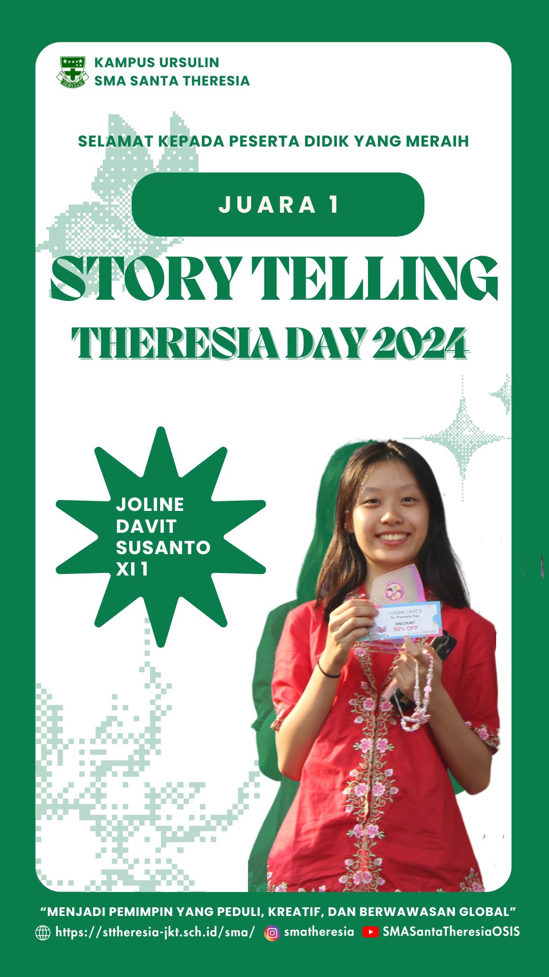 Selamat kepada Joline Davit Susanto (XI – 1) yang berhasil meraih Juara 1 Story Telling pada Theresia Day 2024