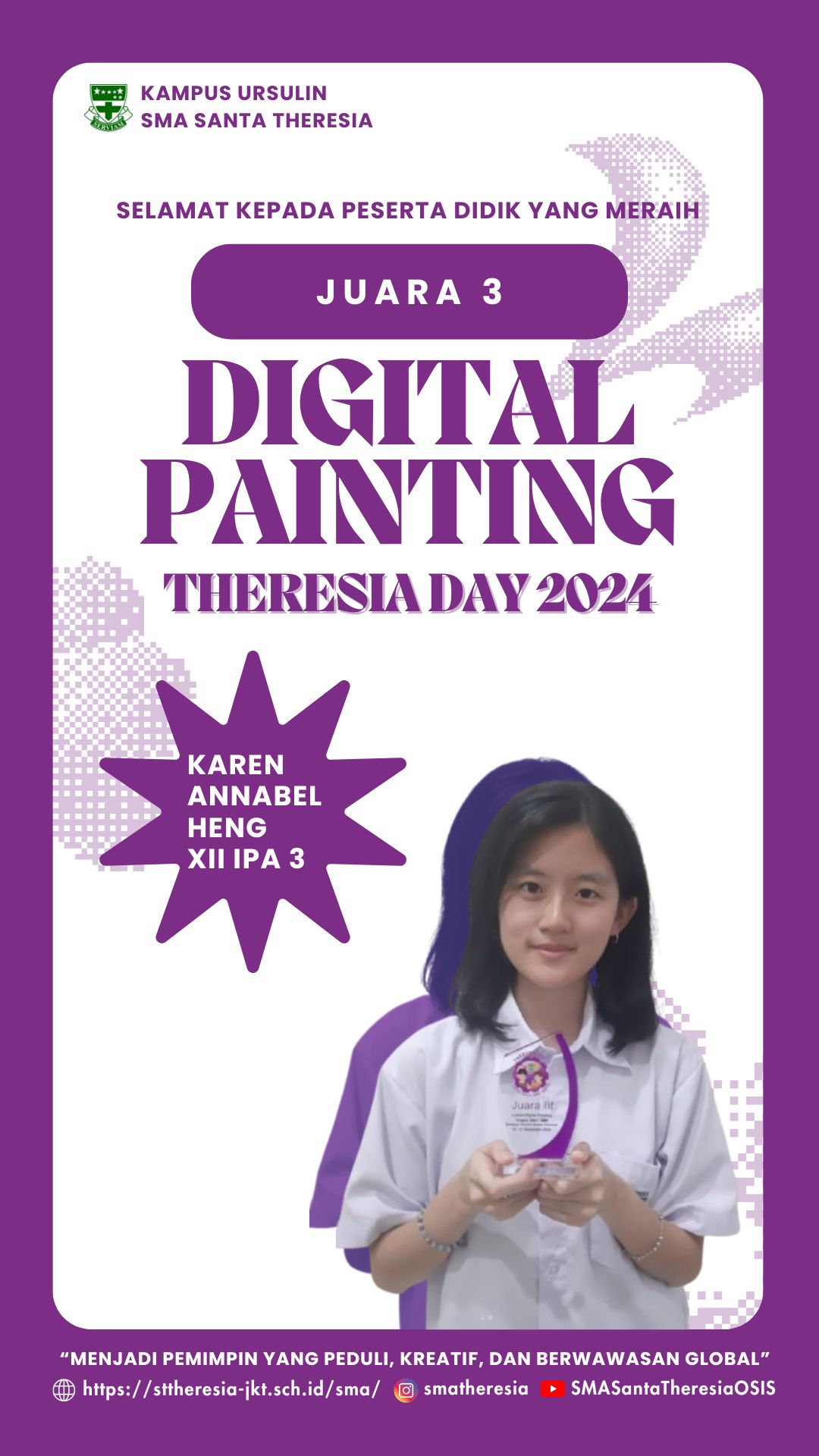 Selamat kepada Karen Annabel Heng (XII – IPA3) yang berhasil meraih Juara 3 Digital Painting pada Theresia Day 2024