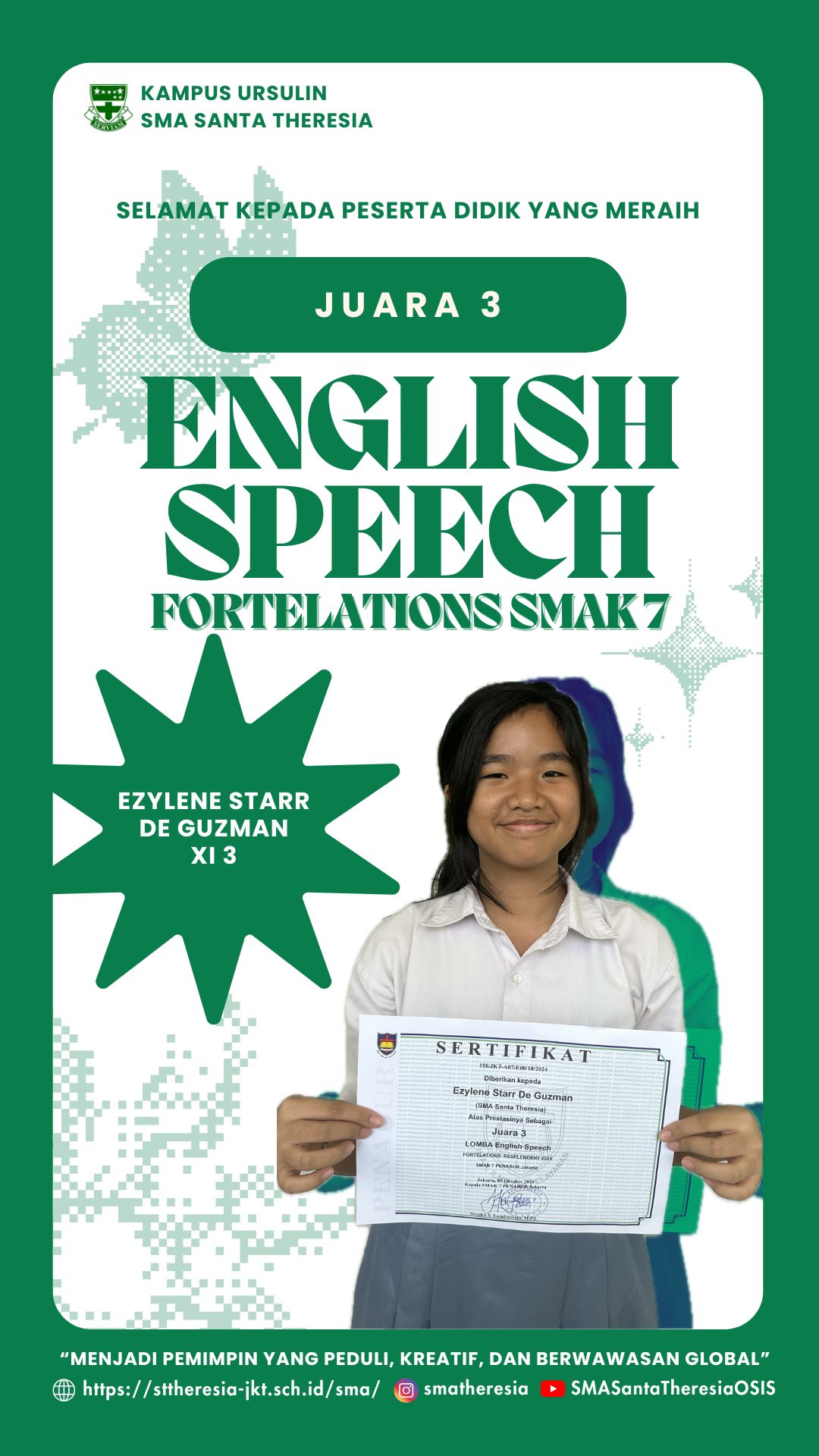 Selamat kepada Ezylene Starr De Guzman (XI – 3) yang berhasil meraih Juara 3 English Speech pada Fortelations SMAK 7