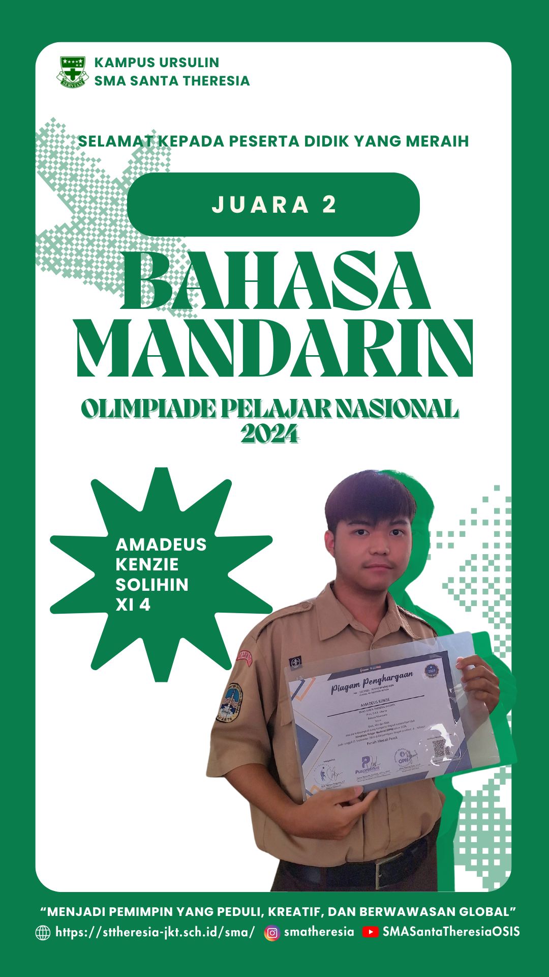 Selamat kepada Amodeus Kenzi Solihin (XI – 4) yang berhasil meraih Juara 2 Bahasa Mandarin pada Olimpiade Pelajar Nasional 2024