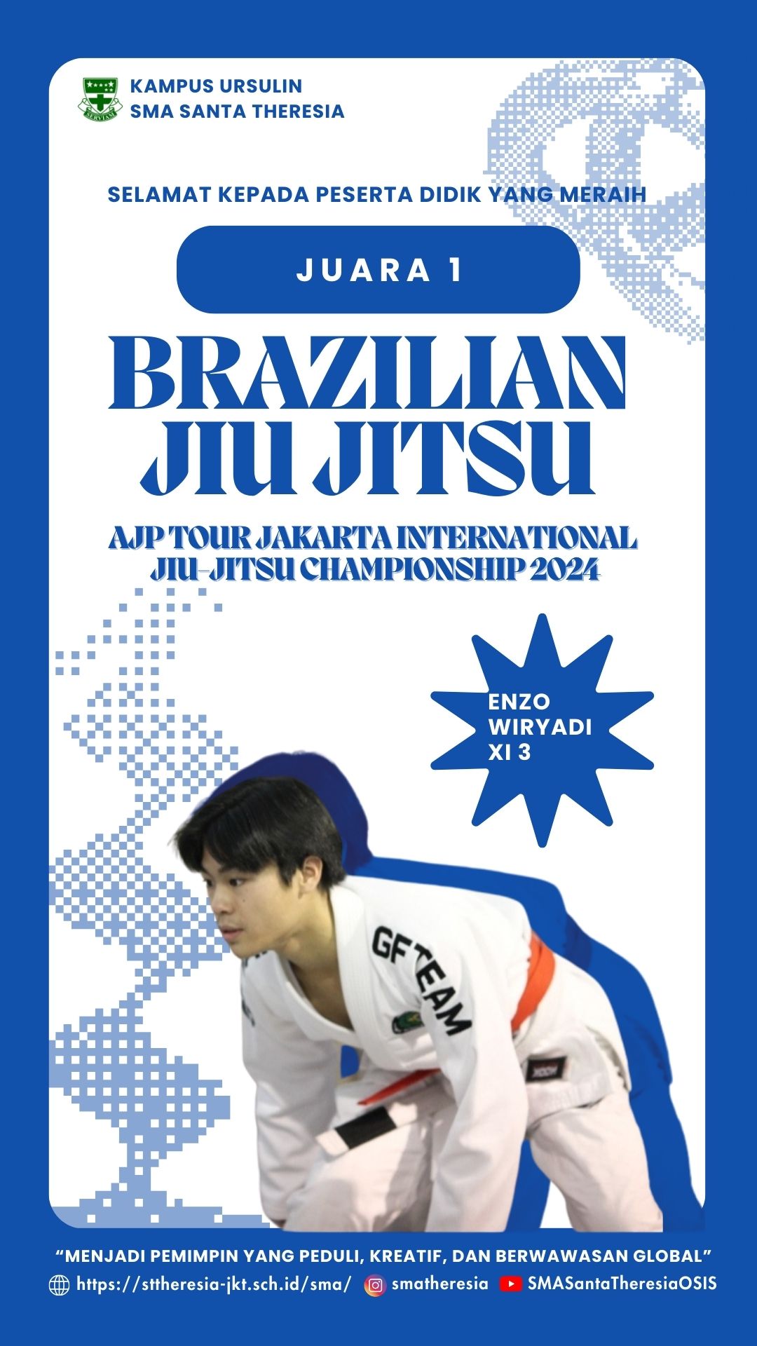 Selamat kepada Enzo Wiryadi (XI – 3) yang berhasil meraih Juara 1 Brazilia Jiu Jitsu pada AJP Tour Jakarta International Jiu Jitsu Championship 2024