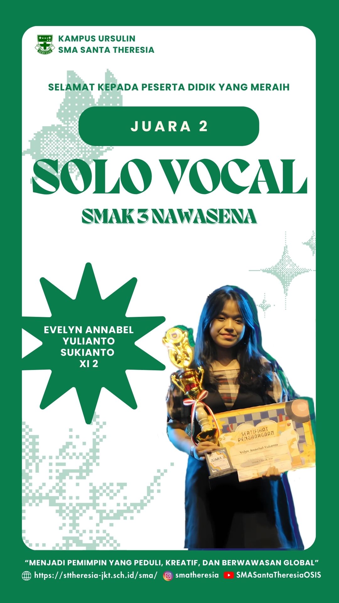 Selamat kepada Evelyn Annabel Yulianto Sukianto (XI – 2) yang berhasil meraih Juara 2 solo vokal di SMAK 3 Penabur Jakarta