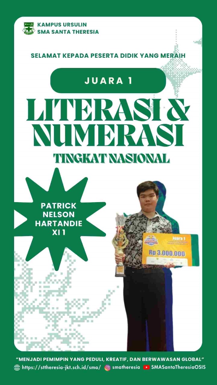 Selamat kepada Patrick Nelson Hartandie (XI – 1) yang berhasil meraih Juara 1 Literasi dan Numerasi Tingkat Nasional 2024