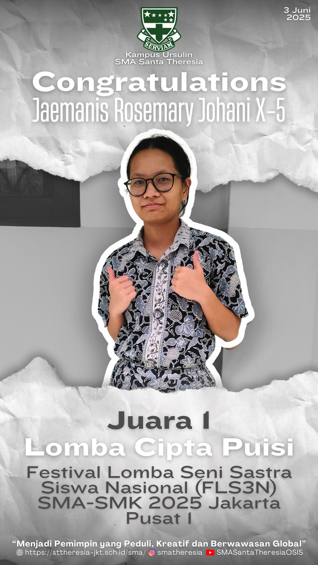Selamat kepada Jaemanis Rosemary Johani yang telah berhasil meraih juara 1 lomba Baca Puisi dalam Festival Lomba Seni Sastra Siswa Nasional (FLS3N) Jakarta Pusat wilayah 1, 3 Juni 2025