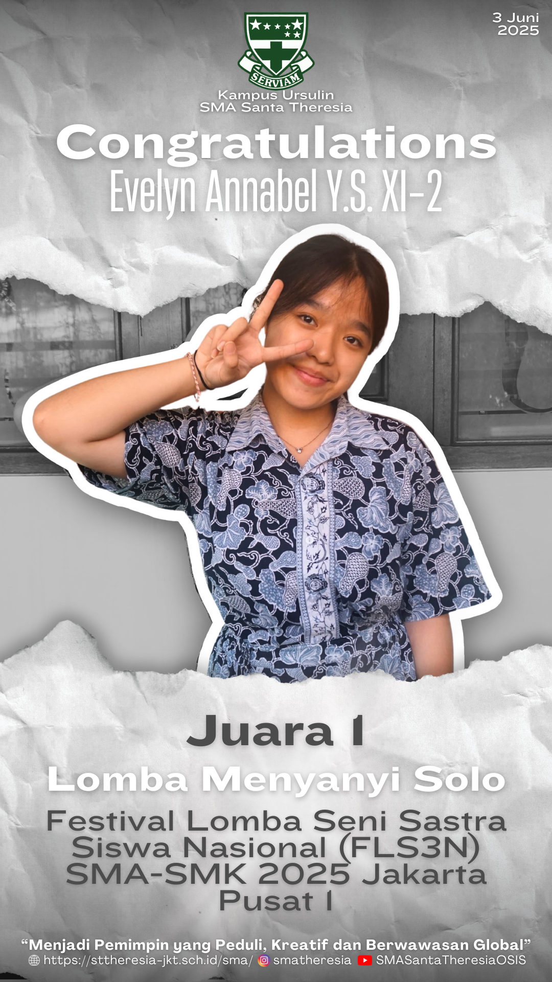 Selamat kepada Evelyn Annabel Y.S yang telah berhasil meraih juara 1 lomba Menyanyi Solo Putri dalam Festival Lomba Seni Sastra Siswa Nasional (FLS3N) Jakarta Pusat wilayah 1, 3 Juni 2025