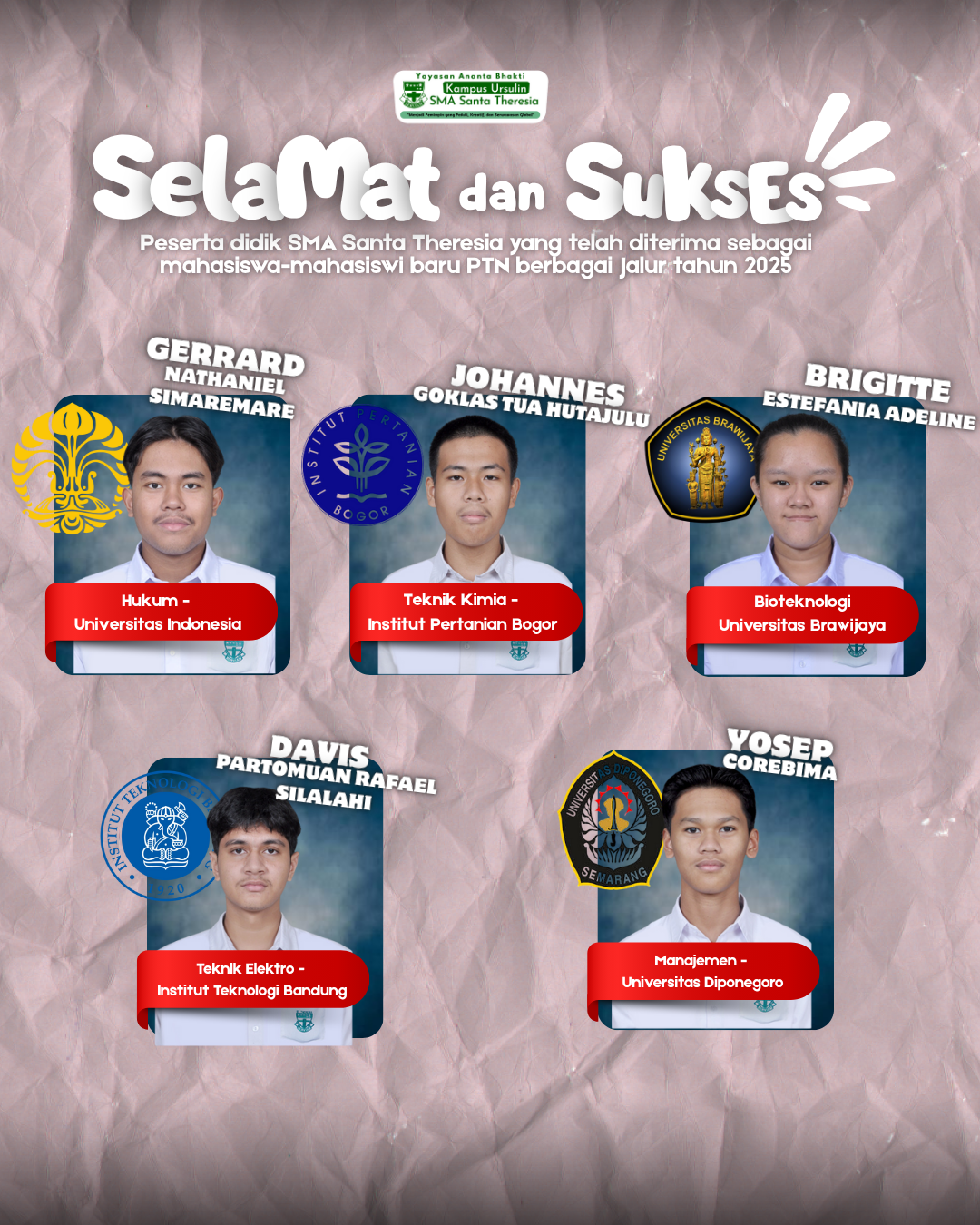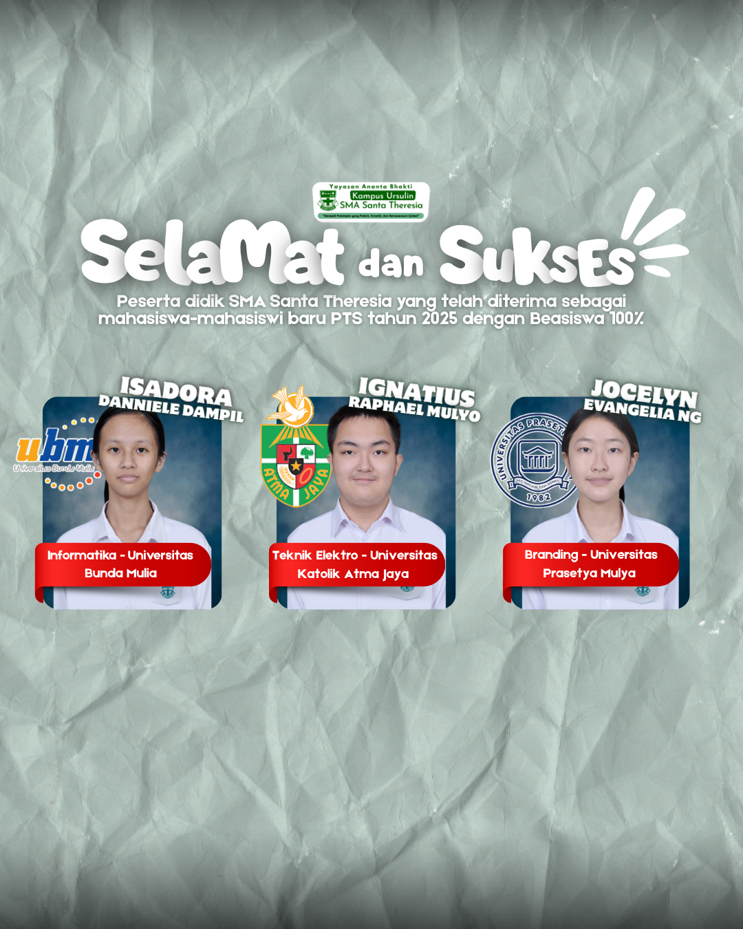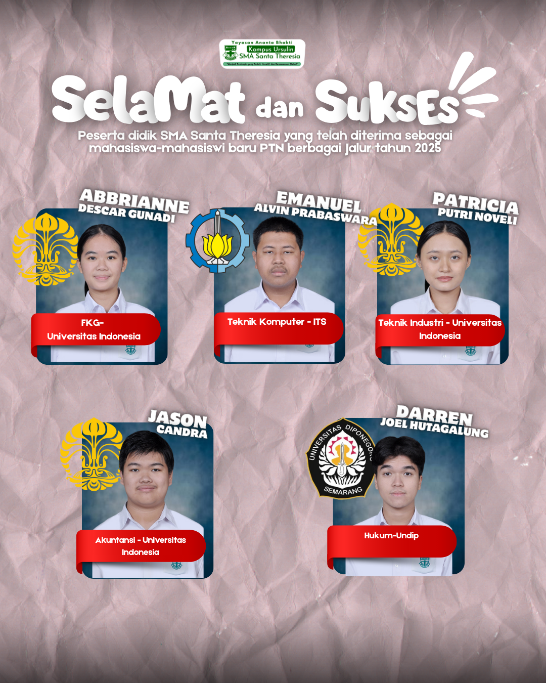 Selamat kepada lulusan SMA Santa Theresia yang telah diterima di perguruan tinggi negeri tahun 2025