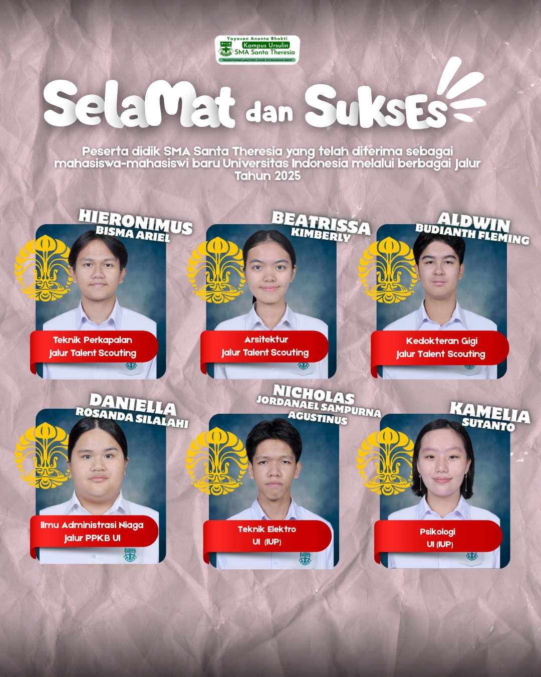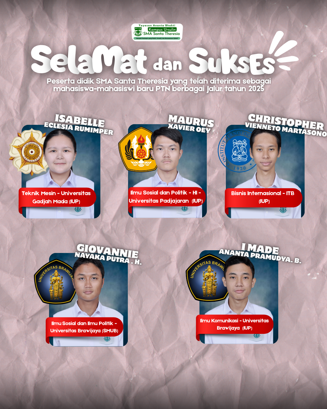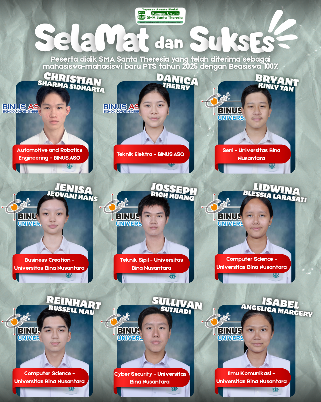 Selamat kepada lulusan SMA Santa Theresia yang telah diterima di perguruan tinggi negeri tahun 2025