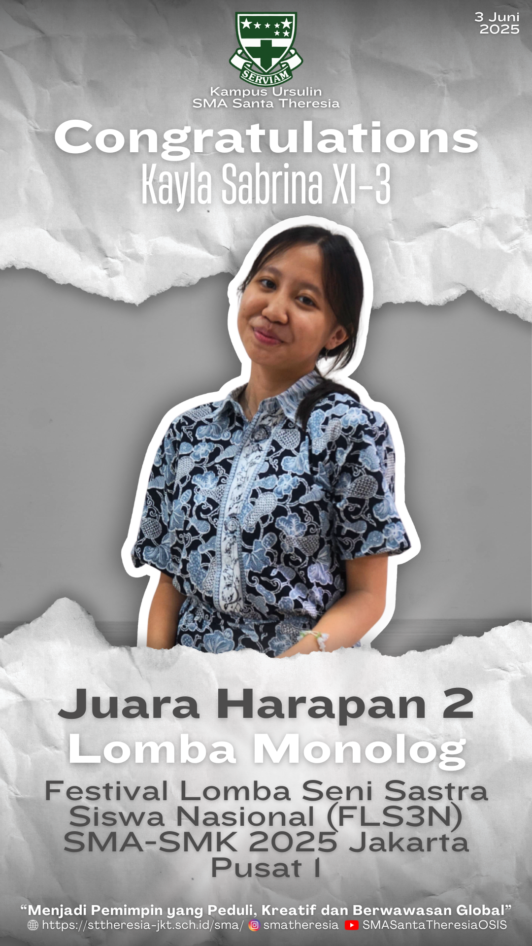 Selamat kepada Kayla Sabrina yang telah berhasil meraih juara harapan 2 lomba Monolog dalam Festival Lomba Seni Sastra Siswa Nasional (FLS3N) Jakarta Pusat wilayah 1, 3 Juni 2025