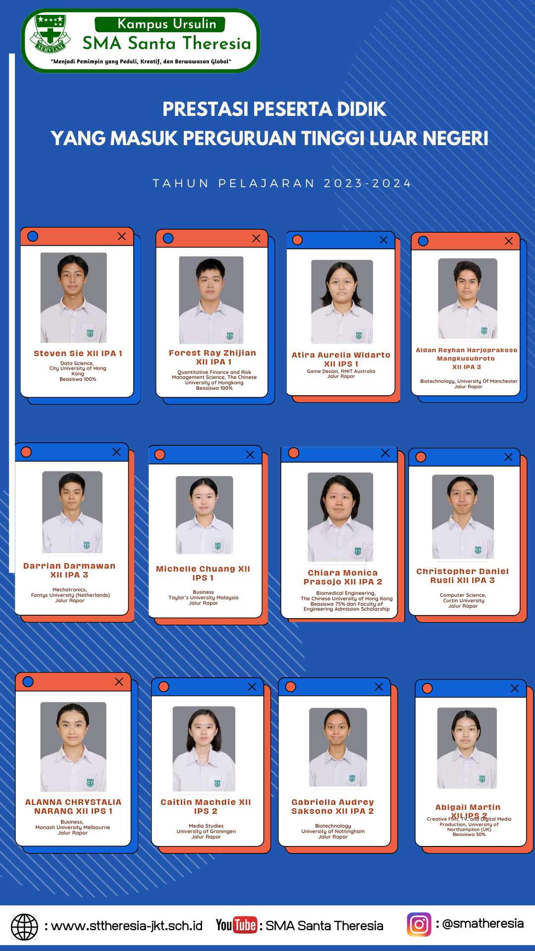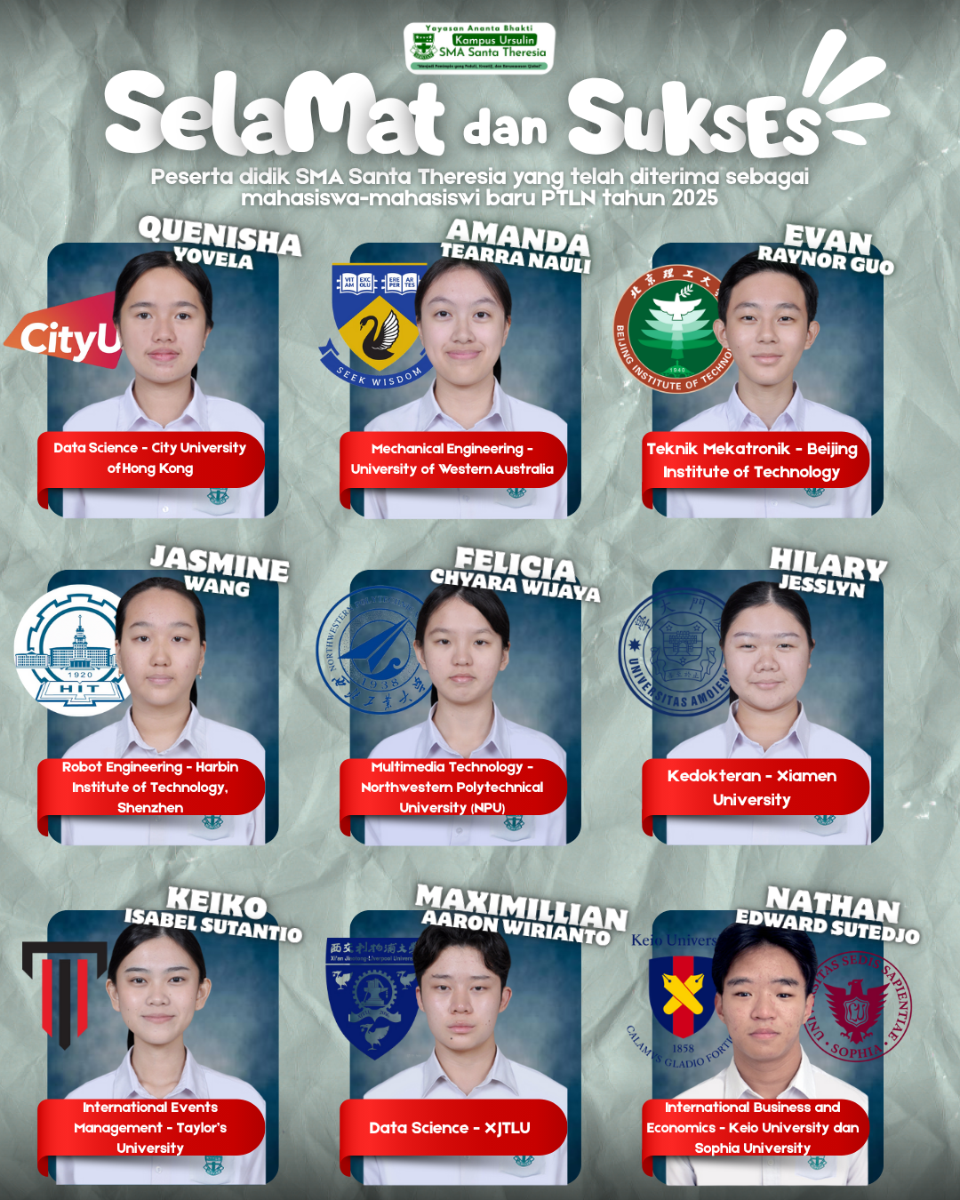 Selamat kepada lulusan SMA Santa Theresia yang telah diterima di perguruan tinggi luar negeri tahun 2025
