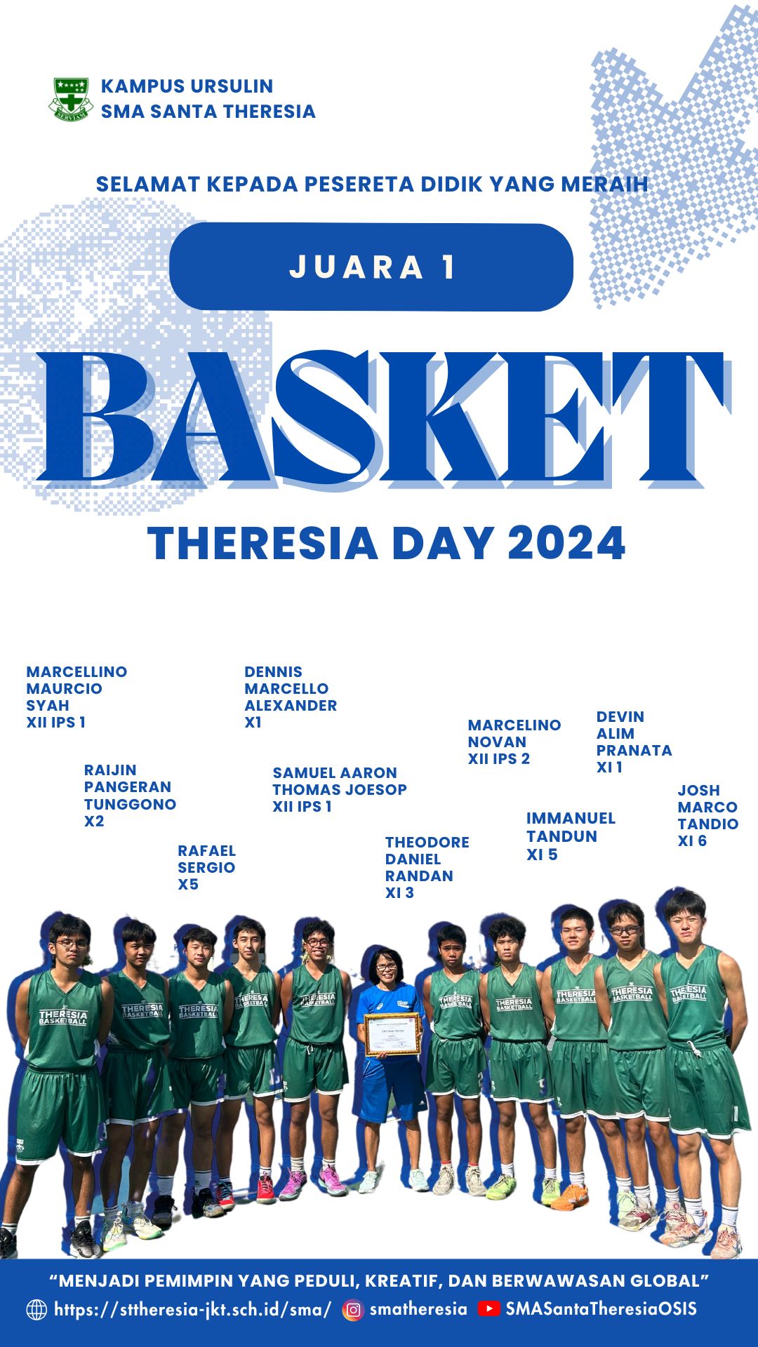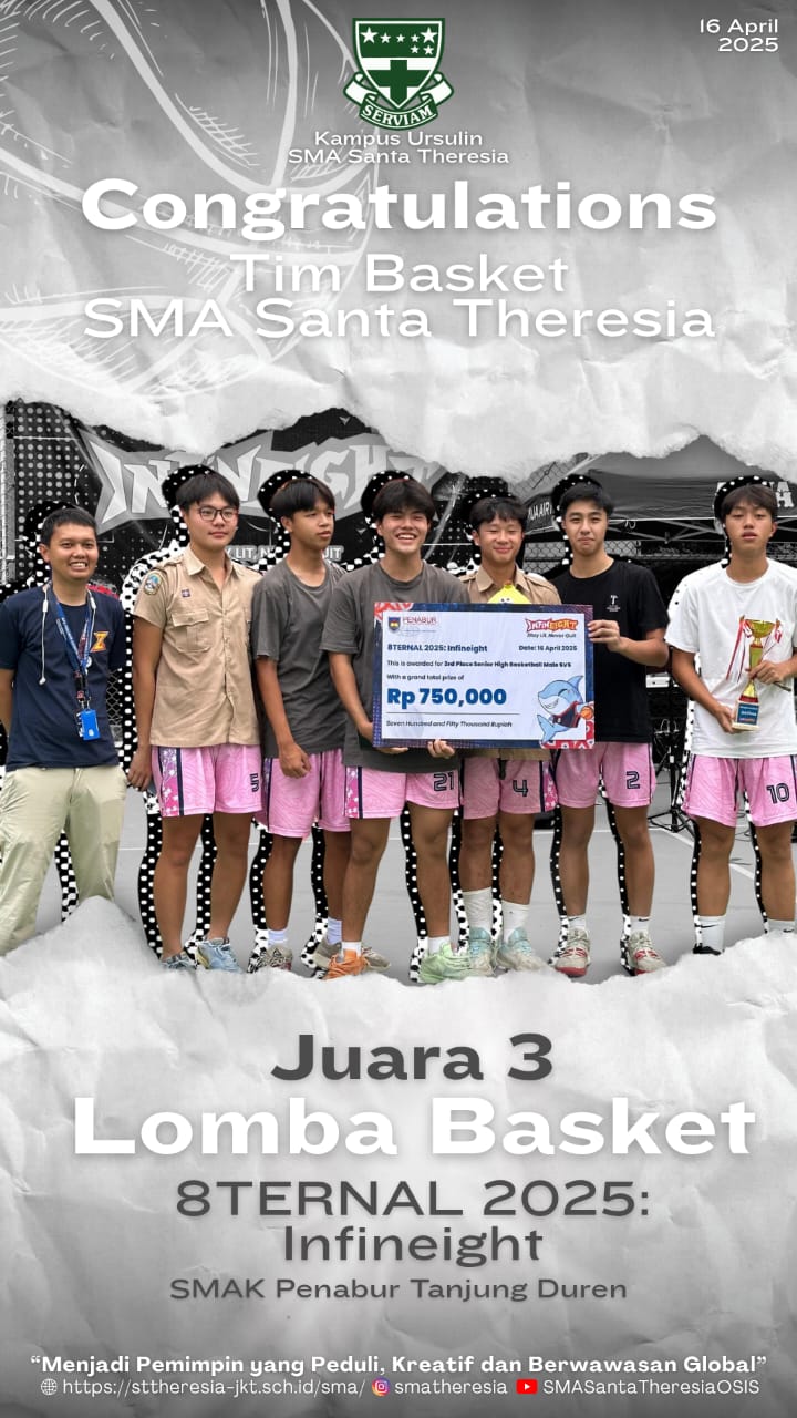 Selamat kepada tim basket SMA Santa Theresia yang telah berhasil meraih juara 3 lomba Basket dalam event 8ternal 2025 di SMAK Penabur Tanjung Duren, 16 April 2025