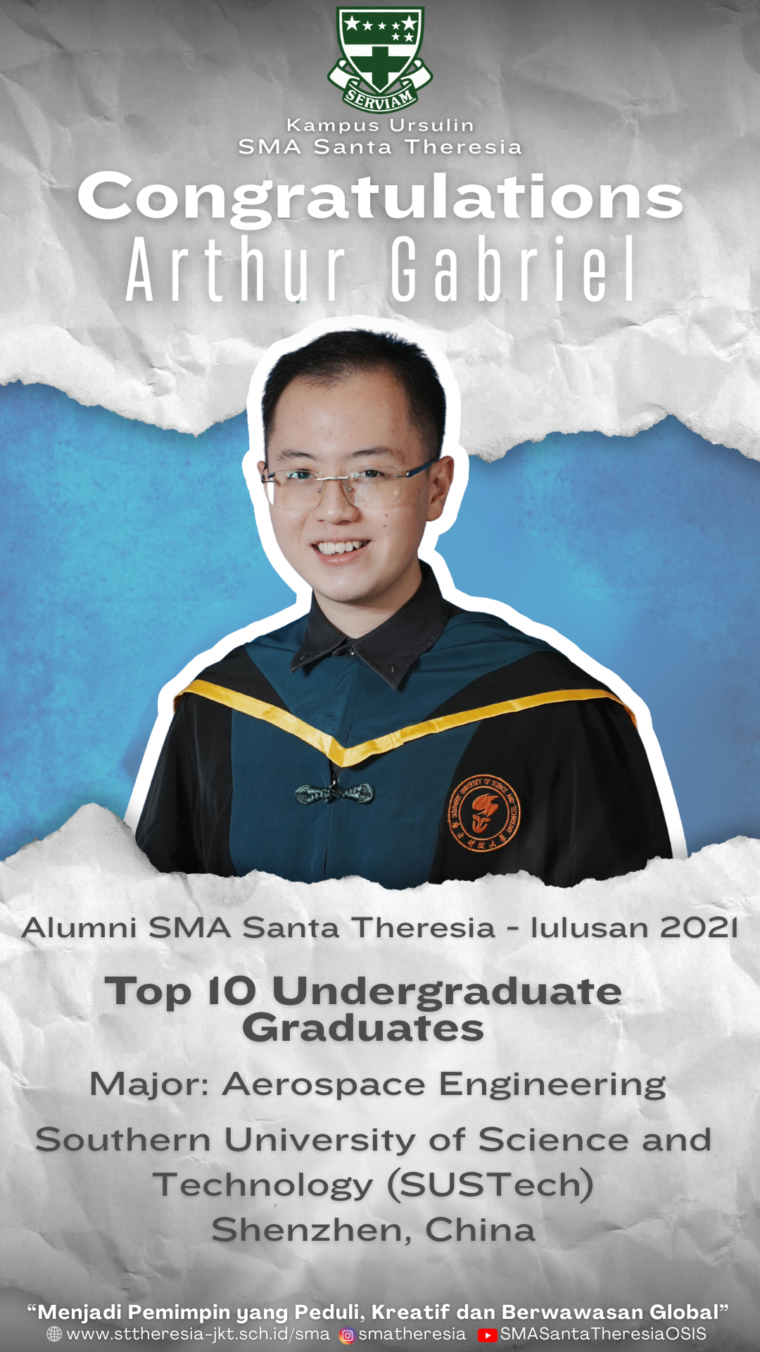 Selamat kepada Arthur Gabriel (Alumni SMA Santa Theresia lulusan tahun 2021) sebagai Top 10 Undergraduate Graduates, Major: Aerospace Engineering, Southern University of Science and Technology (SUSTech) Shenzhen, China.