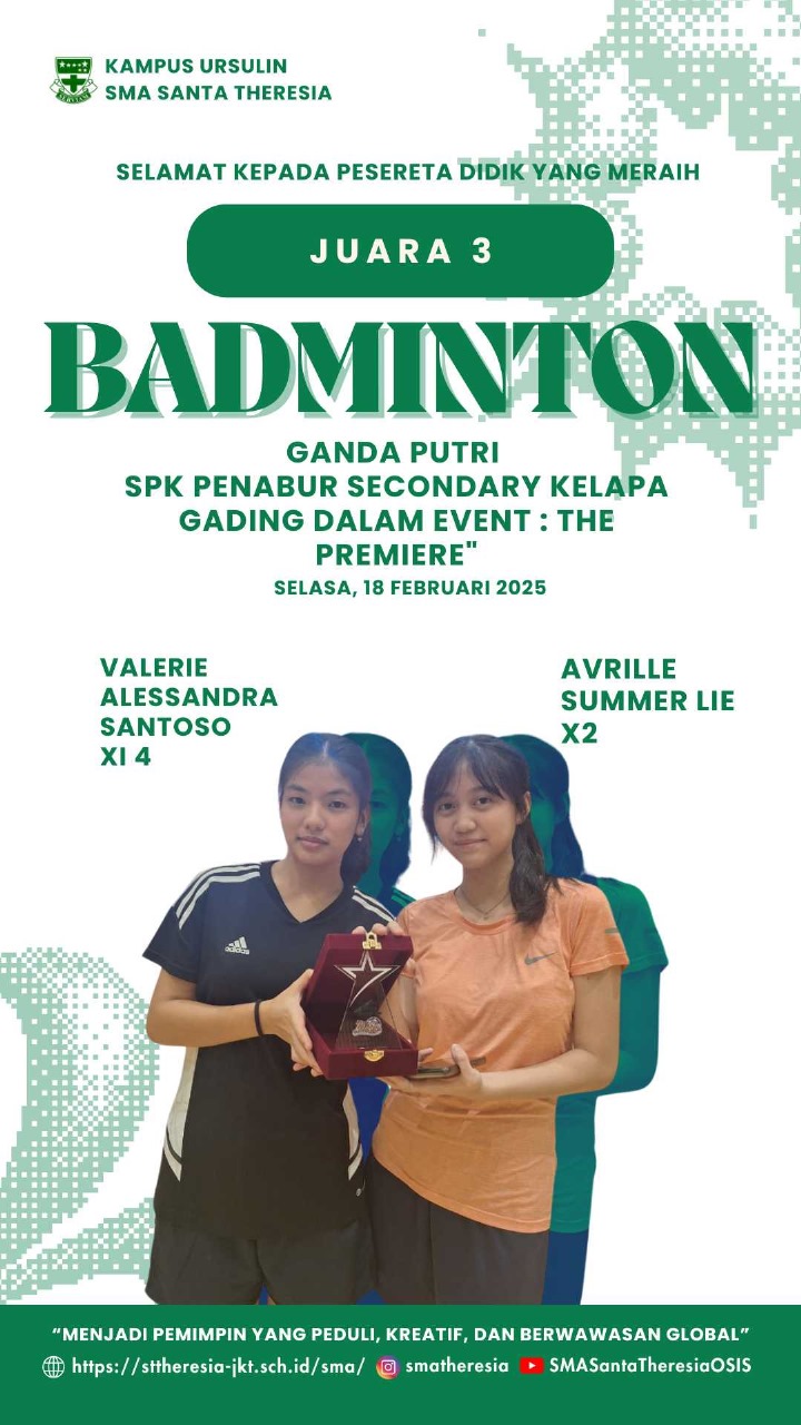 Selamat kepada Valerie dan Avrille yang telah berhasil meraih juara 3 Badminton Ganda Putri di SPK Penabur Secondari Kelapa Gading dalam event the premiere pada Selasa, 18 Februari 2025