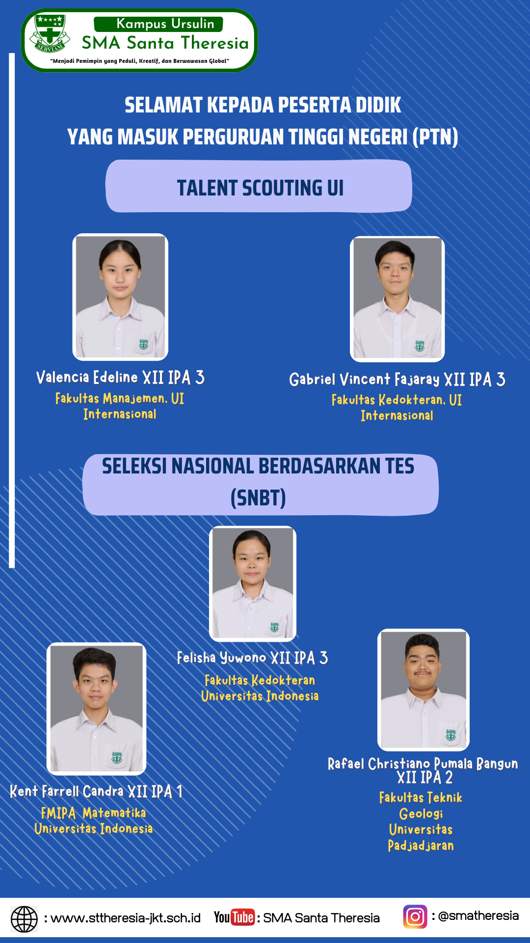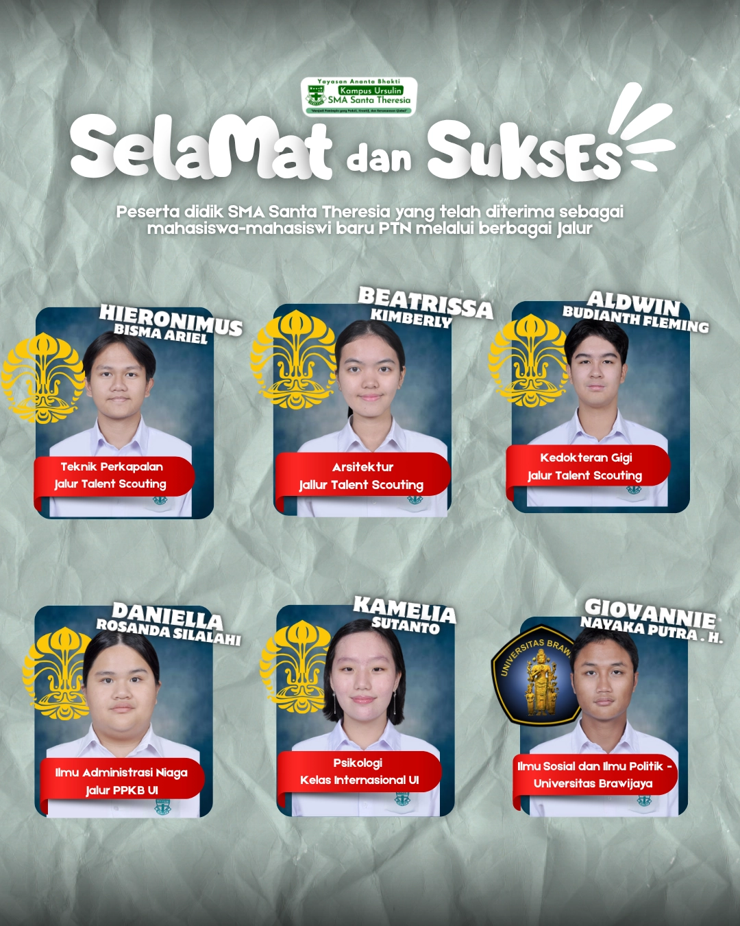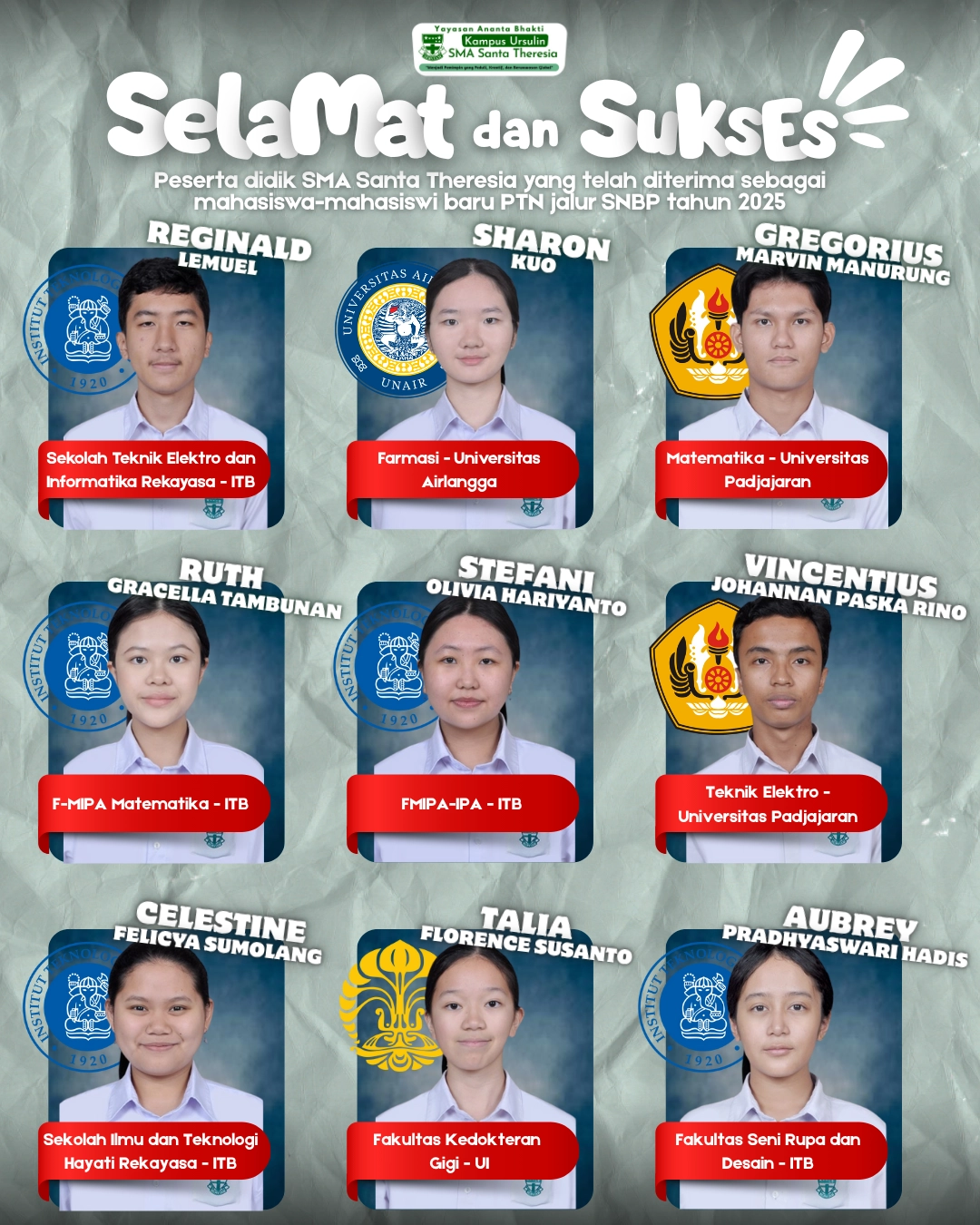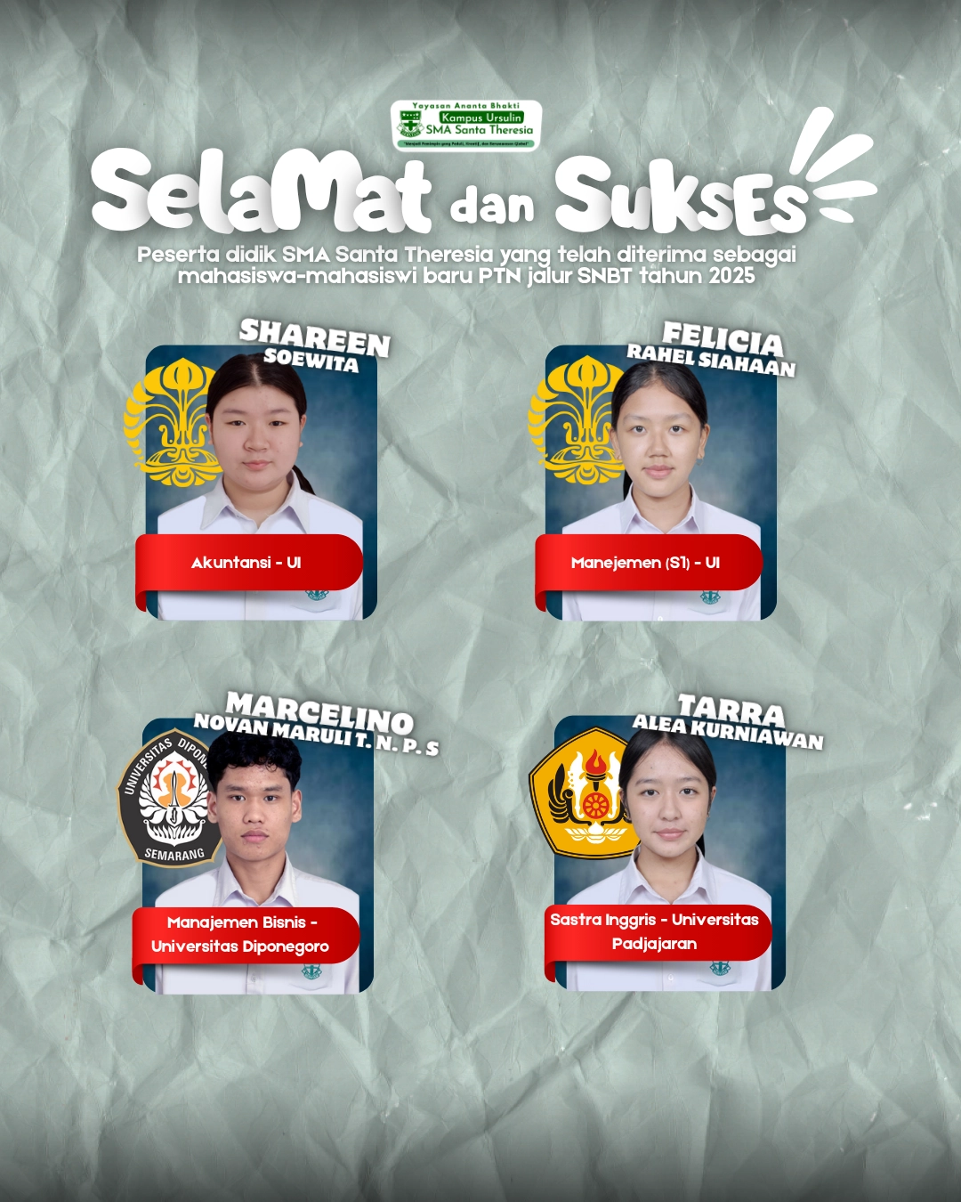 Selamat kepada lulusan SMA Santa Theresia yang telah diterima di perguruan tinggi negeri jalur seleksi nasional berdasarkan tes (SNBT) tahun 2025