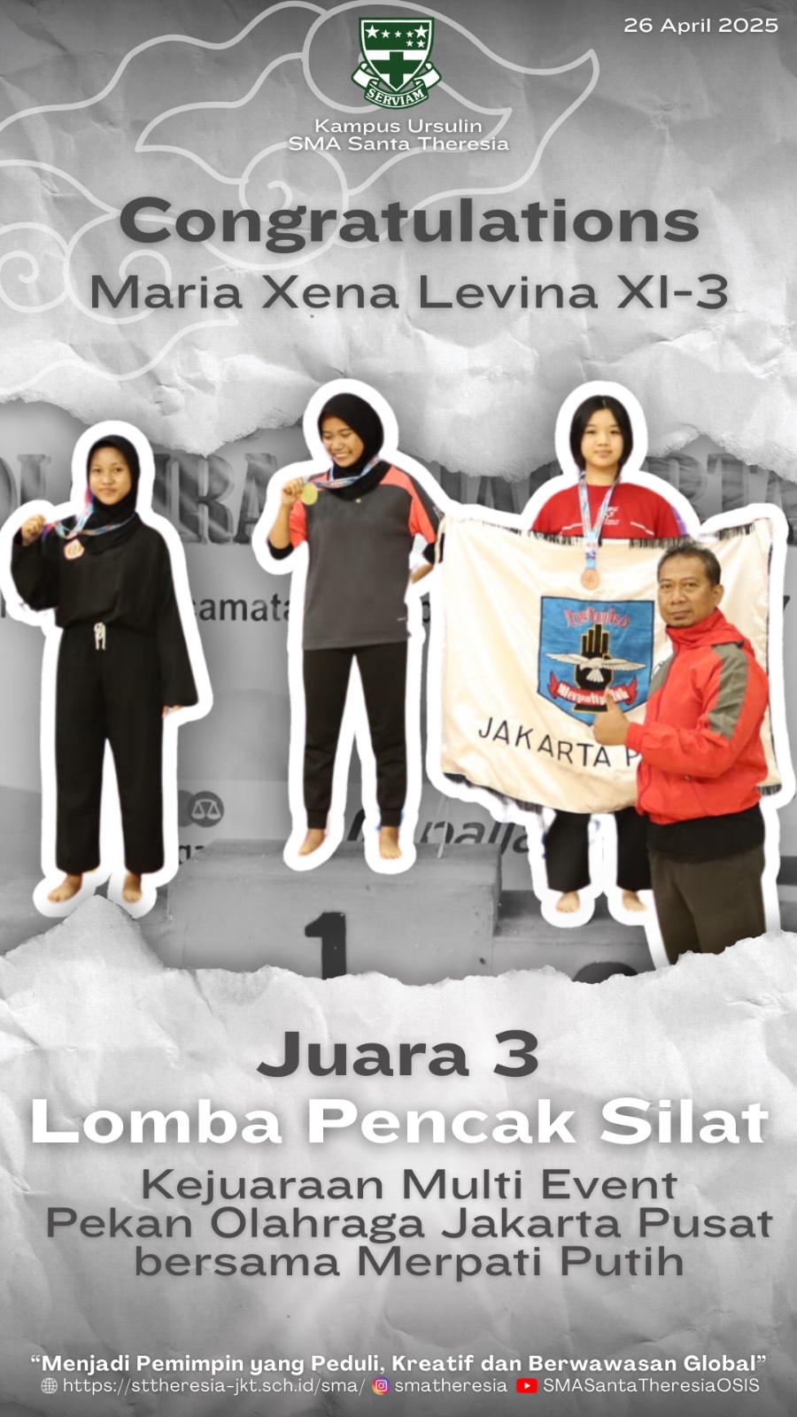 Selamat kepada Maria Xena Levina yang telah berhasil meraih juara 3 lomba Pencak Silat dalam kejuaraan Multi Ecent Pekan Olahraga Jakarta Pusat, 26 April 2025