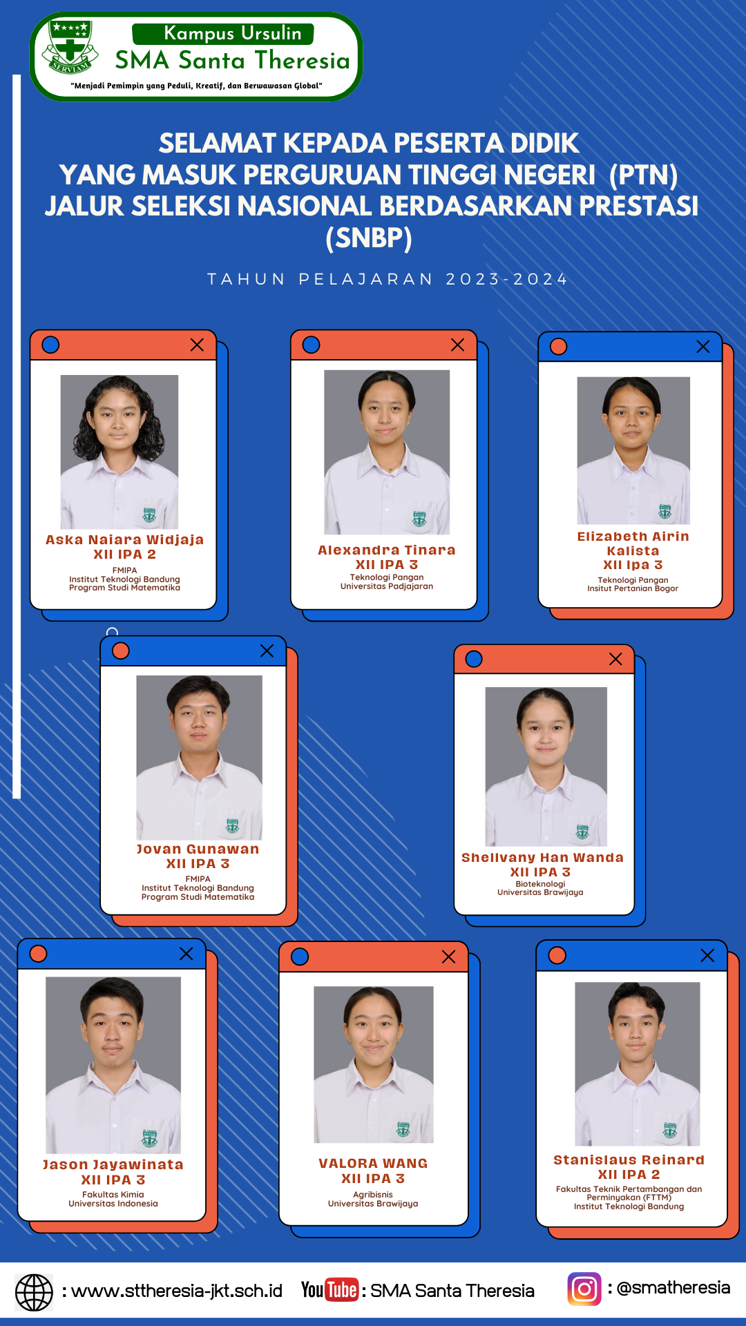 Selamat kepada lulusan SMA Santa Theresia yang telah diterima di perguruan tinggi negeri jalur seleksi nasional berdasarkan prestasi (SNBP) tahun 2025